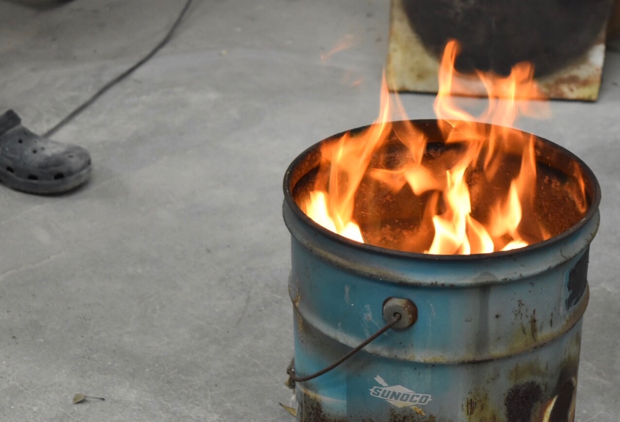 耐火レンガを組み立てた簡易式のガス窯をつくり、高温の窯から直接引き出し、燻しながら焼き上げる手法です。